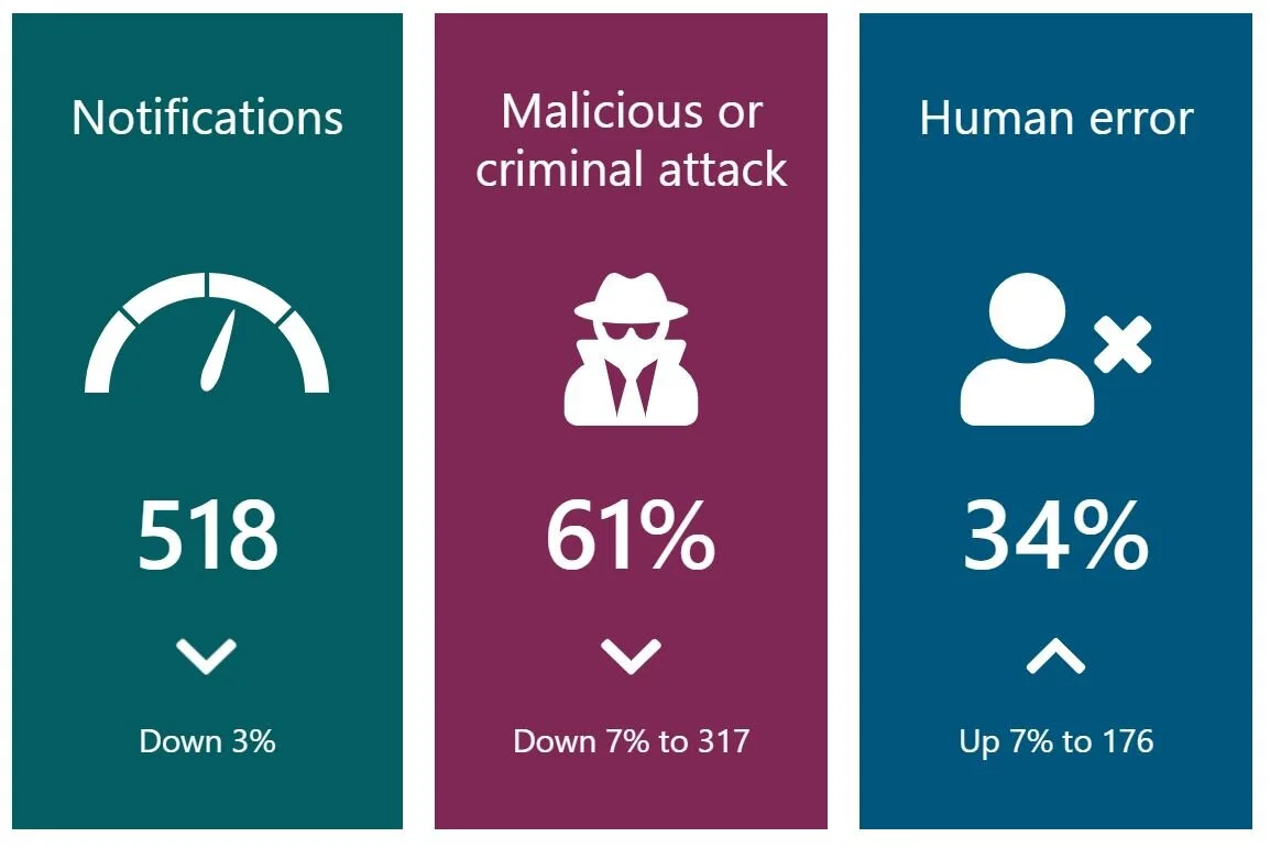 The snapshot shows more than half of the notified data breaches have been malicious or criminal attack related with the remainder being human error or a system fault. Many of the cyber incidents during this period appear to involve a human factor such as clicking phishing emails or disclosing passwords.